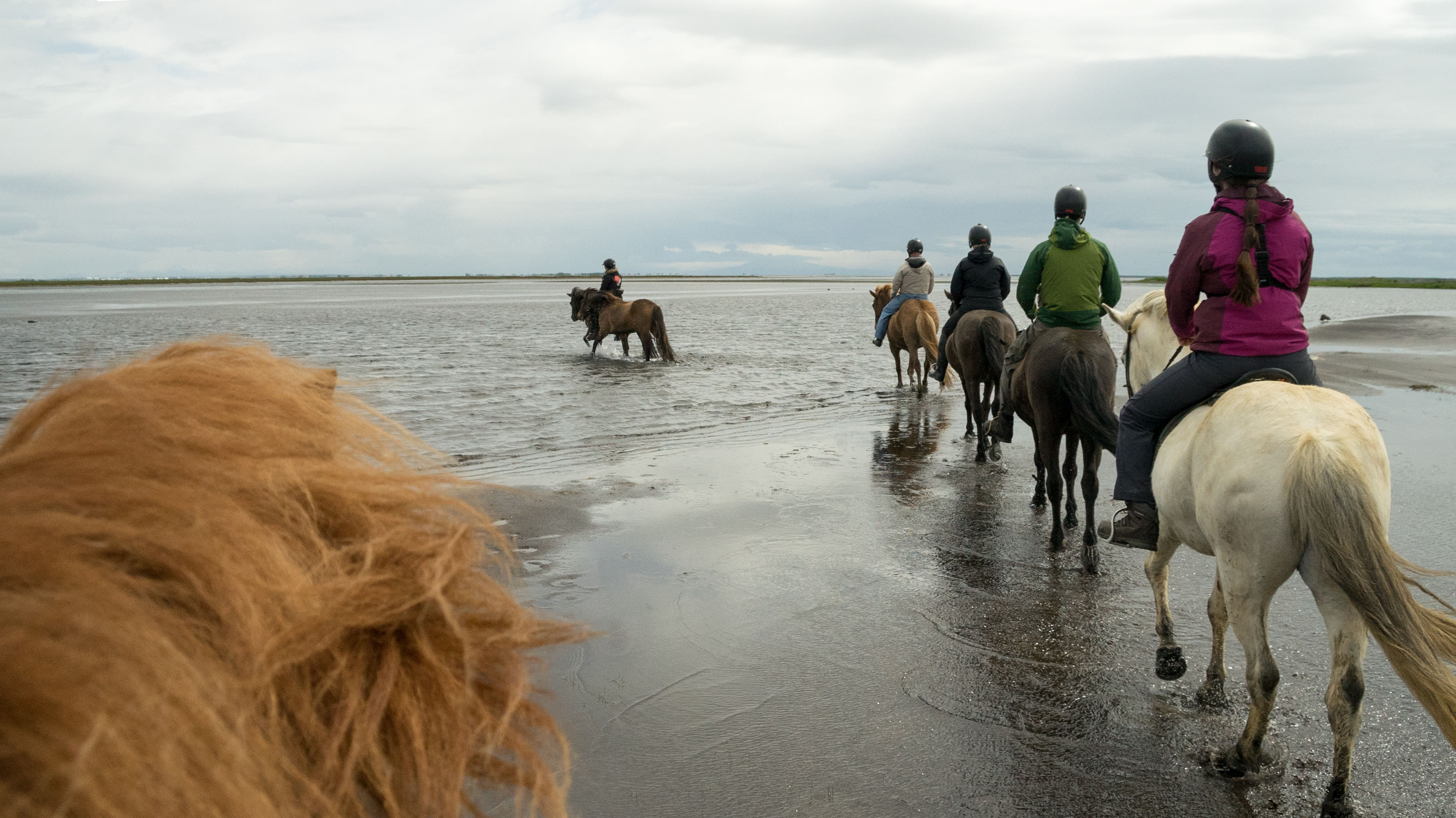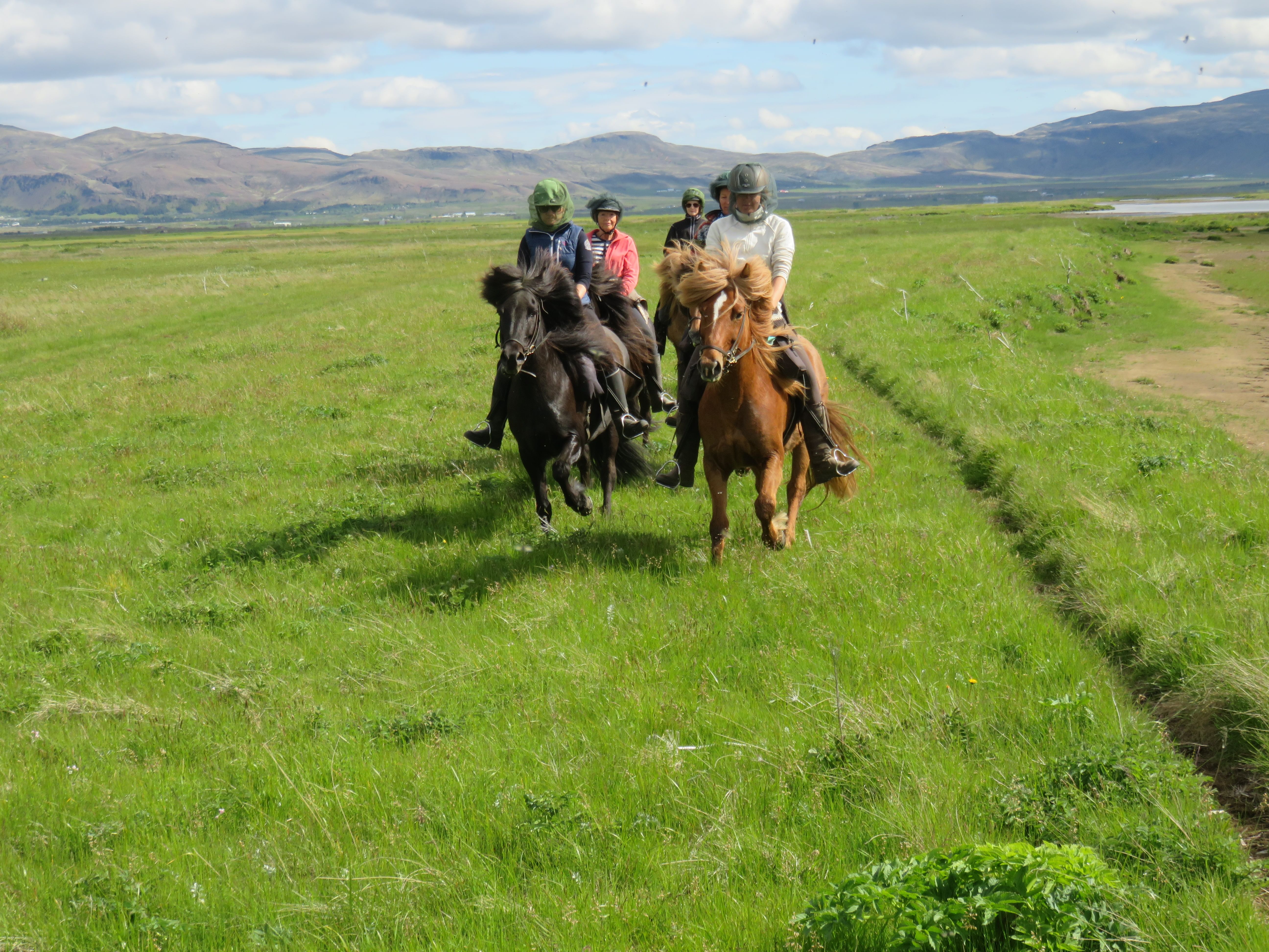 We go on a tour starting at the beach next to the small fishing town Thorlákshöfn. We follow the beach, riding on soft black lava sand to the picturesque area where the mighty river Ölfusá meets the sea. We continue our tour through shallow water at the edge of the river delta and ride on the soft, green river banks back to our farm Vellir. On our way we enjoy spectacular views, weather permitting, and have good chances to see birds of various kinds. (The tour can also start at our farm and end at Thorlákshöfn, depending on tides).