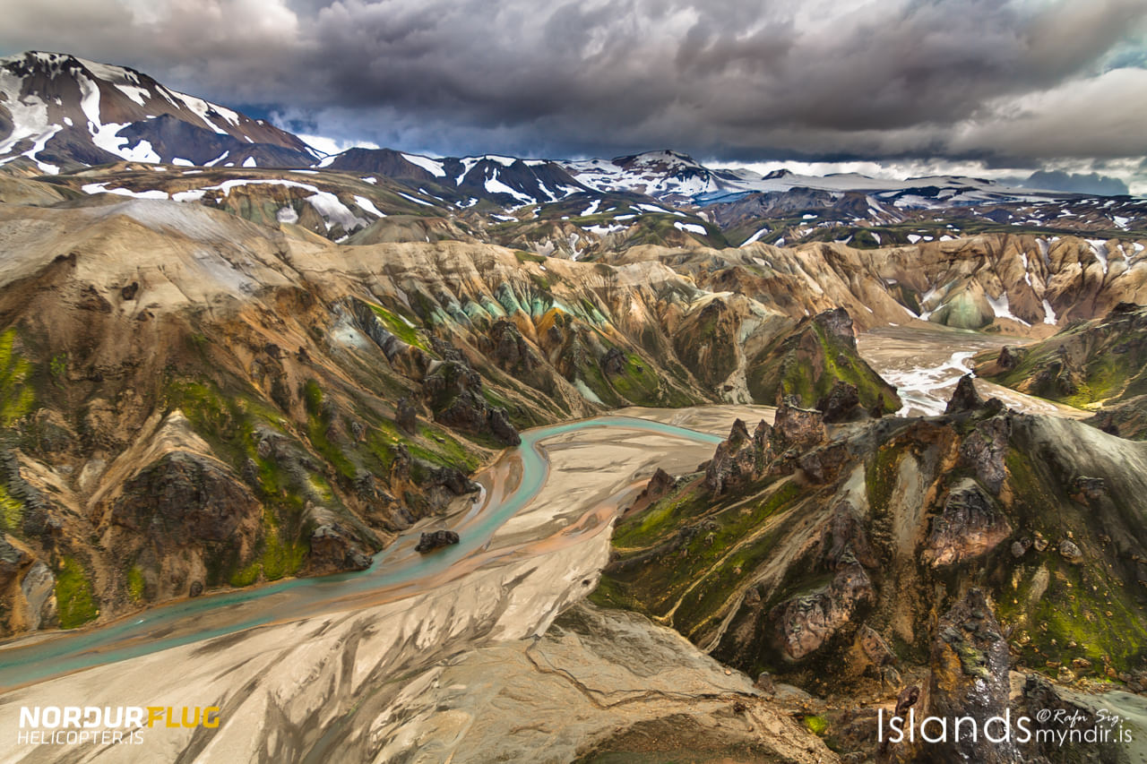 As we head back on a westerly heading we fly over the countless Vatnajökull glacier tongues, past the highest peak of Iceland, and to the remote and rugged Fjallabak nature reserve. You'll see parts of the island that are hidden to all but a few and get access to highland lakes, braided rivers, glacial-hewn valleys, towering mountains and majestic and primeval volcanic scenery. We'll explore the colourful mountain ranges around Landmannalaugar geothermal area and Hraftinnusker before we fly past Hekla volcano en route back to Reykjavík city.