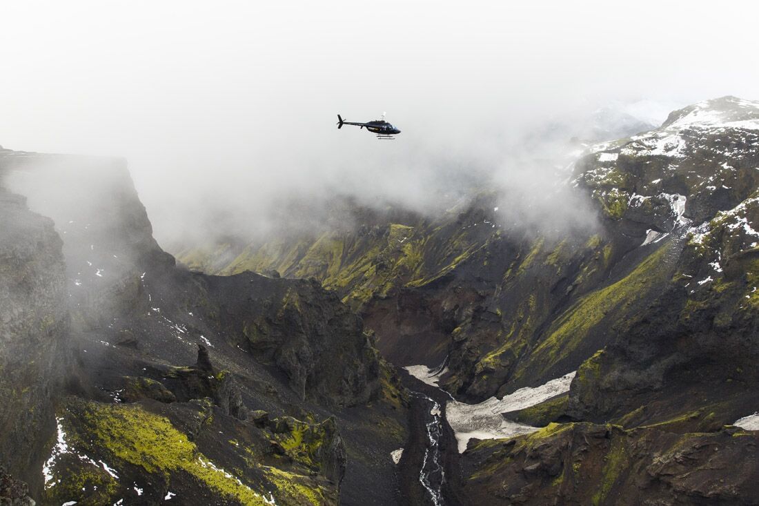 timing to take a selfie next to the helicopter. After the stop we will follow a trail of towering waterfalls as they drop out of the mountains to the black
