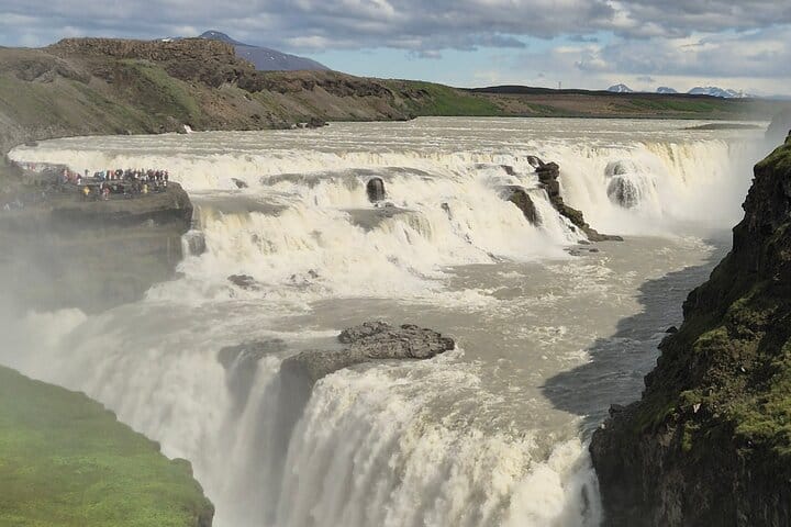 - Gullfoss Waterfall (The Golden Falls): Stand in awe before one of Iceland’s most majestic waterfalls, where glacial water cascades dramatically into a rugged canyon, creating a misty spectacle of power and beauty.